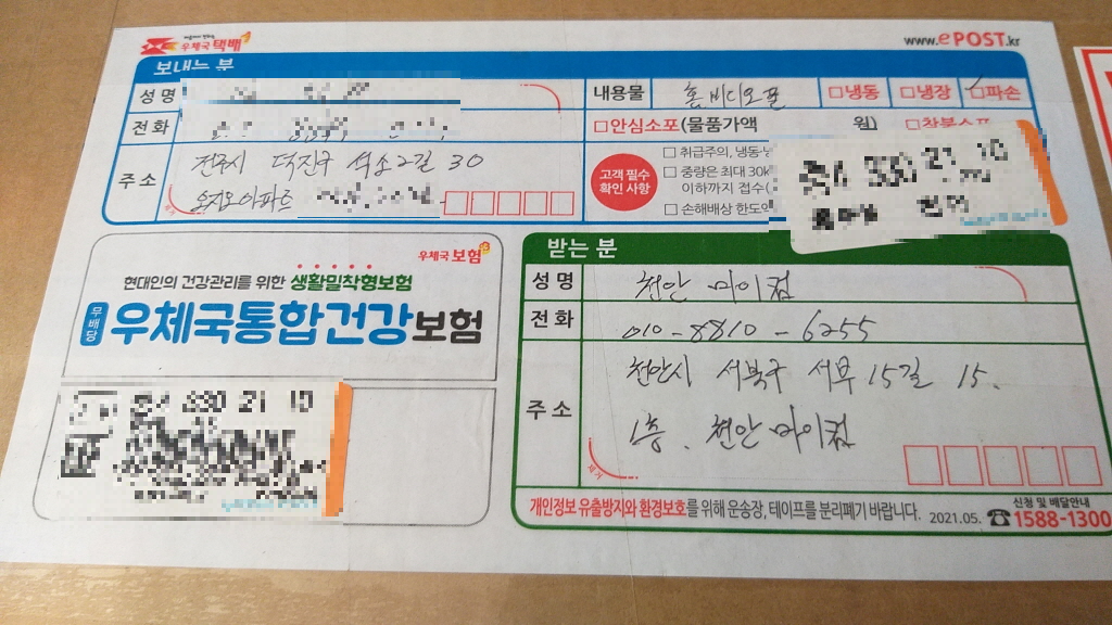 전화 상담 후 전주시 덕진구 석소2길 30 선변 오지오 아파트에서 택배를 이용하여 입고되었습니다.