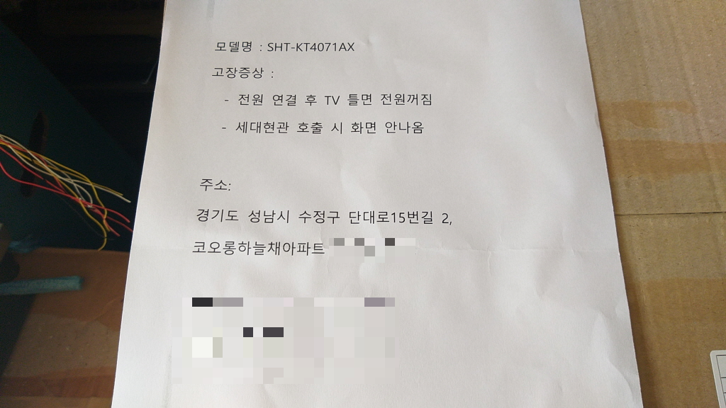 성남시 수정구 코오롱 하늘채 아파트에서 SHT-KT105XM 주방용 아날로그 TV폰 고장으로 택배로 입고해 주셨습니다.